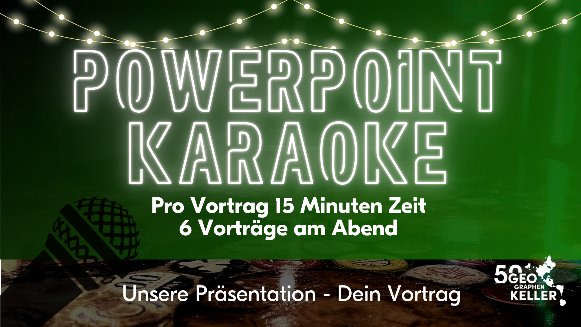 Wir stellen für Euch zufällige PowerPoint Präsentationen zusammen, die Ihr vor einem kleinen Publikum haltet. Für den Gewinner des Abends stellen wir einen Überraschungspreis.