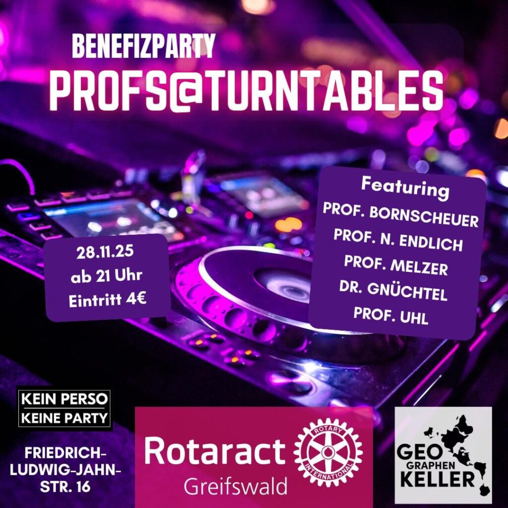 Es ist wieder soweit! Eure Profs legen in unseren heiligen Hallen für Euch auf. Zusammen mit Rotaract veranstalten wir wieder die Profs@TurnTables Party
