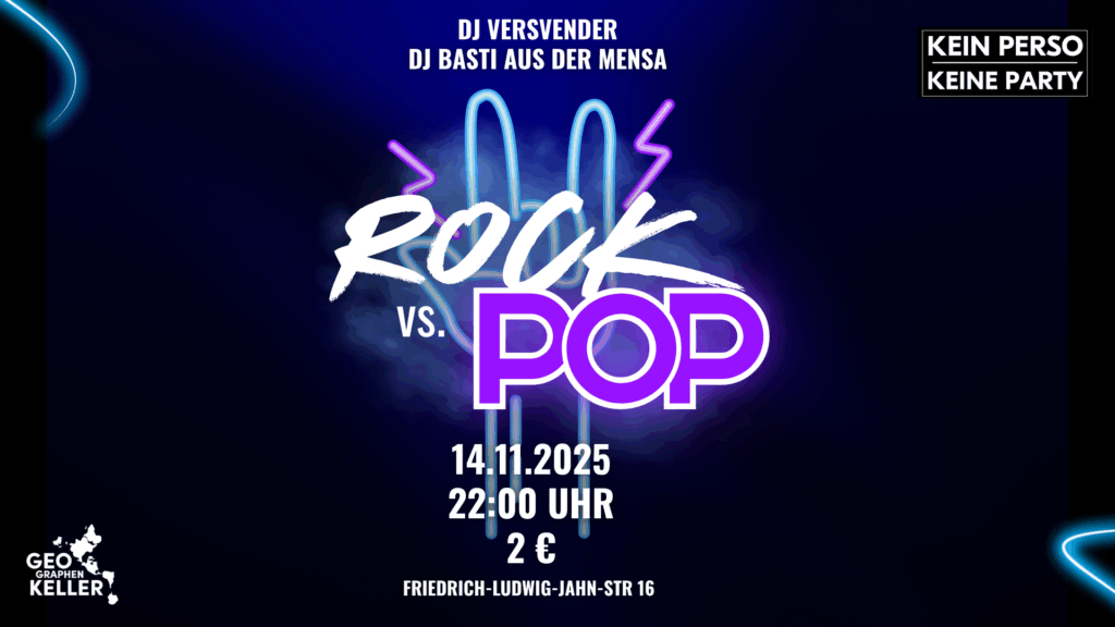 Stimmt bei unserer Rock vs. Pop Party für die Musikrichtung ab, die Ihr am besten findet. Das gewinnende Genre wird zum Motto der ersten Party 2026
